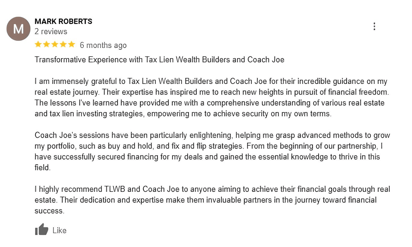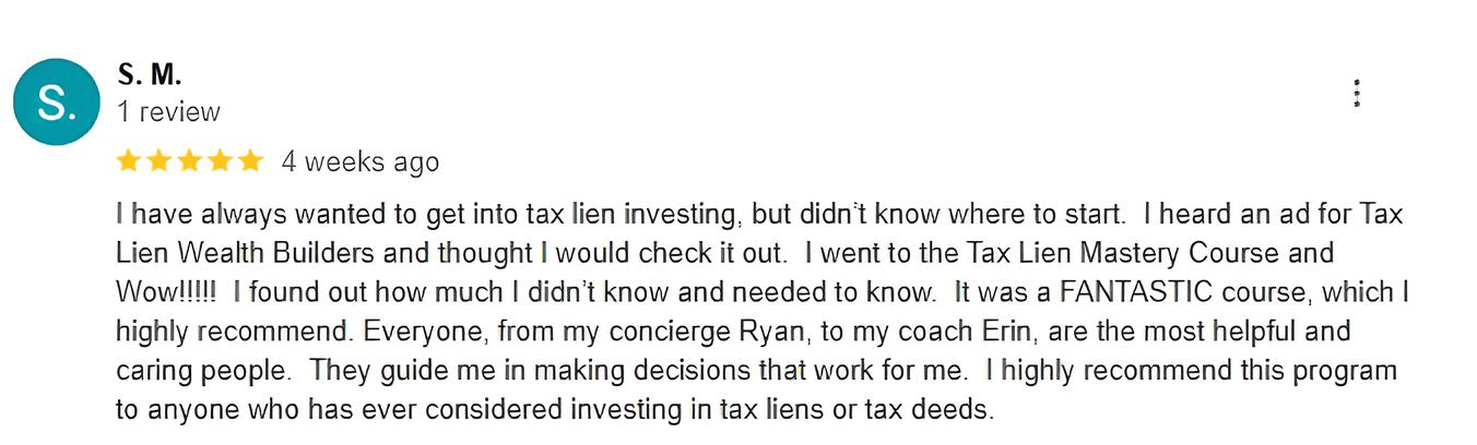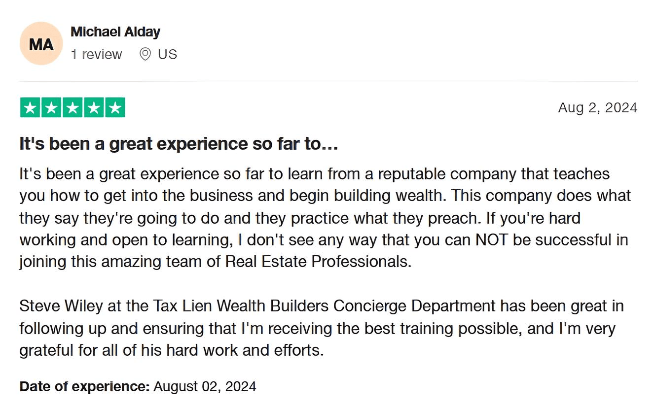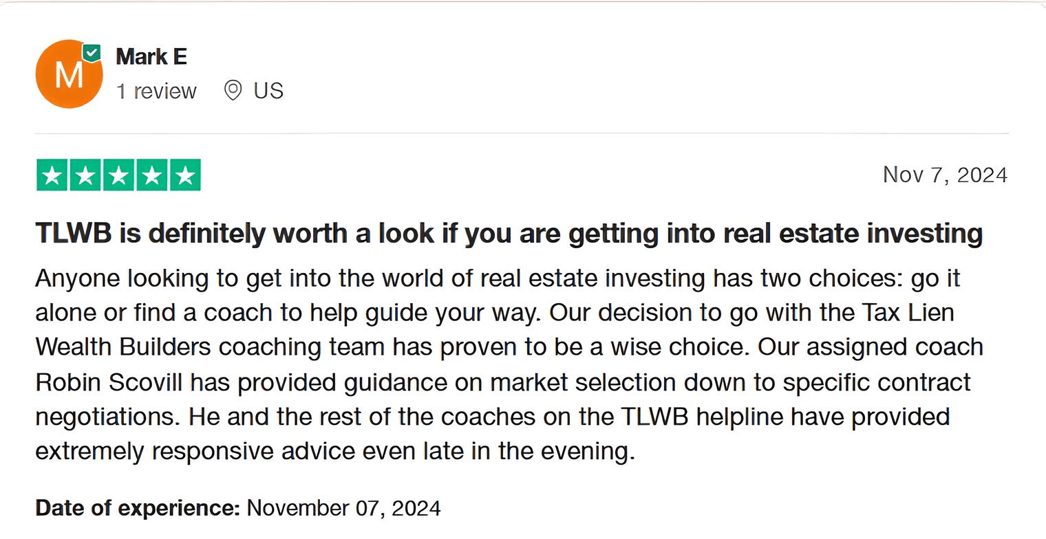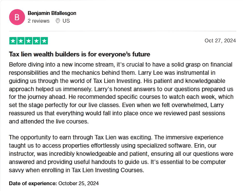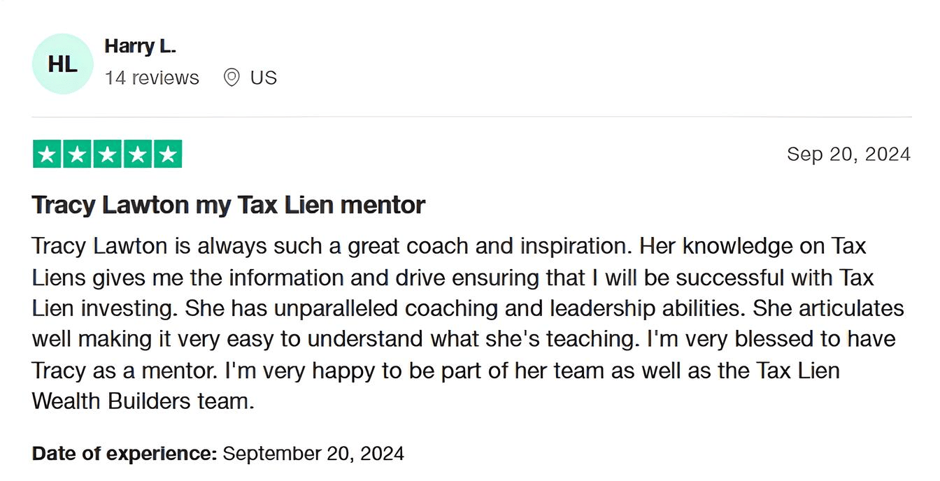 Tax Lien Wealth Builders is a direct-to-consumer real estate education and training company. We do not sell a business opportunity, “get rich quick” program or money-making system. We believe, with education, individuals can be better prepared to make investment decisions, but we do not guarantee success in investing. We do not make earnings claims, efforts claims, return on investment claims, or claims that our training will make you any money. Statements and depictions are the opinions, findings, or experiences of individuals who generally have purchased education and training. Results vary, are not typical, and rely on individual effort, time, and skill, as well as market conditions and other factors. We do not measure earnings or financial performance. Instead, we track completed transactions and satisfaction of services by voluntary surveys. Results show that most Advanced Training customers who apply the training and make offers ultimately complete transactions. You should not, however, equate completed transactions with financially successful transactions. Further, many customers do not continue with the program, do not apply what they learn, or do attempt to apply what they learn but nonetheless have difficulty in making real estate successful for them. You should assume that most customers do not complete transactions. The Company may link to content or refer to content and/or services created by or provided by third parties that are not affiliated with the Company. The Company is not responsible for such content and does not endorse or approve it. The Company may provide services by or refer you to third-party businesses. Some of these businesses have common interest and ownership with the Company. Third-party company names, logos, and products are trademarks or registered trademarks of their respective holders. I understand that by submitting this application, I am also authorizing Tax Lien Wealth Builders and its partners to obtain my personal credit profile through a soft inquiry under the FCRA solely to conduct a credit pre-qualification.