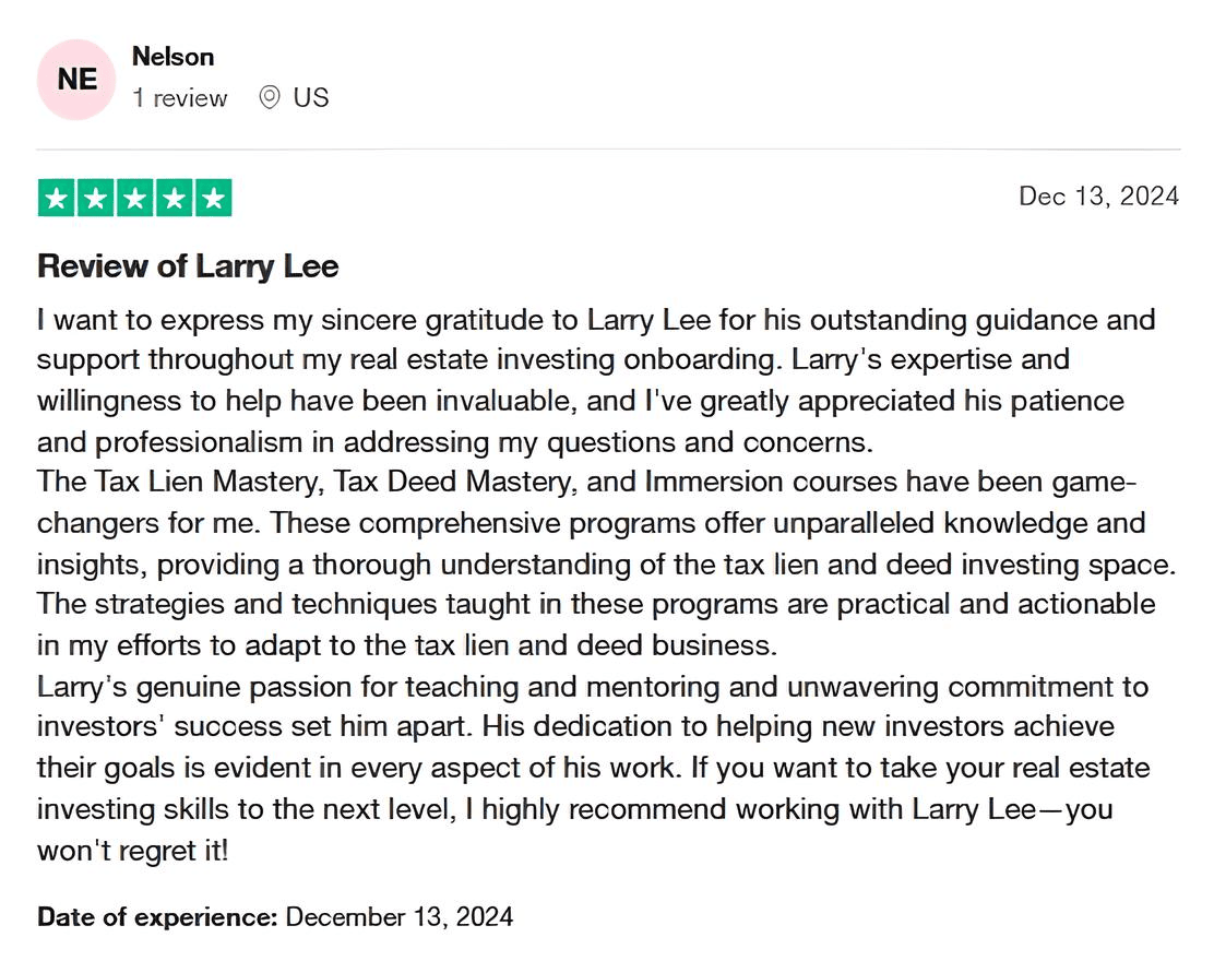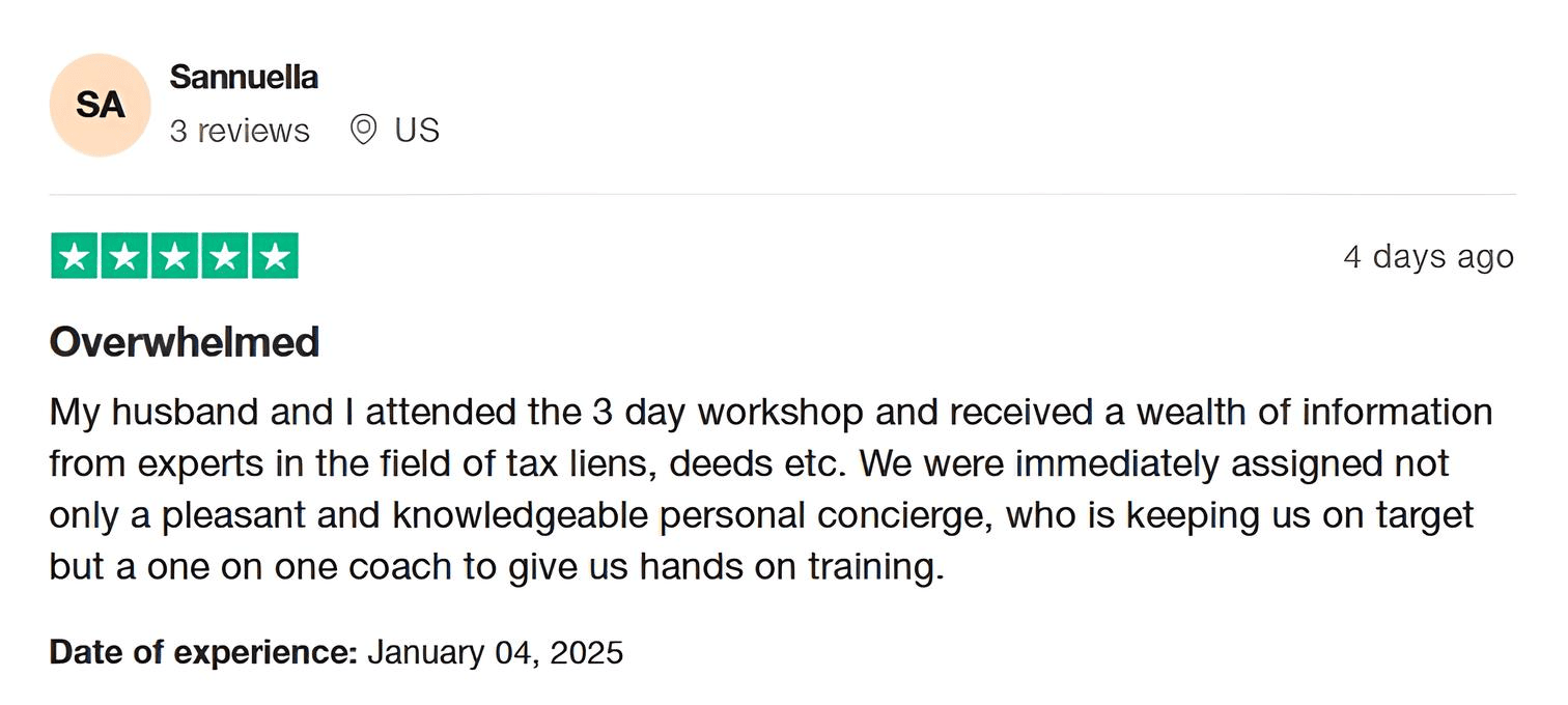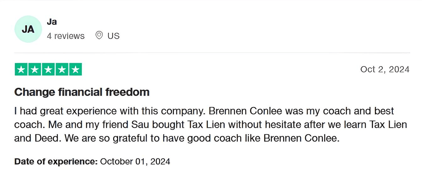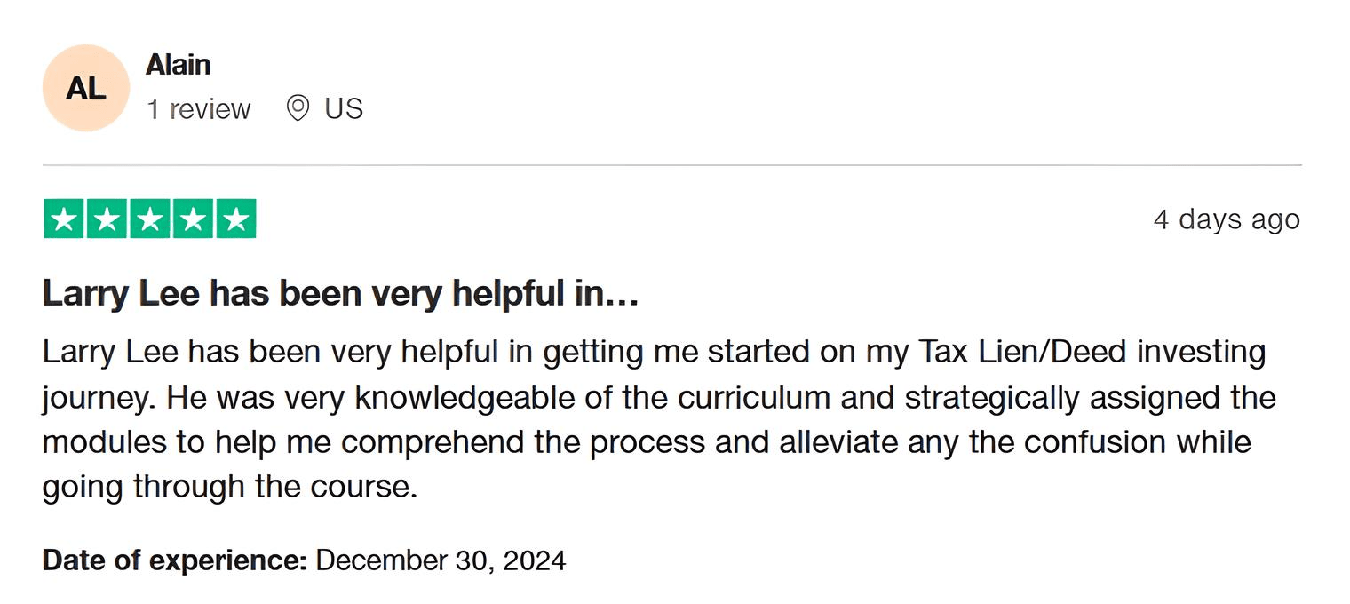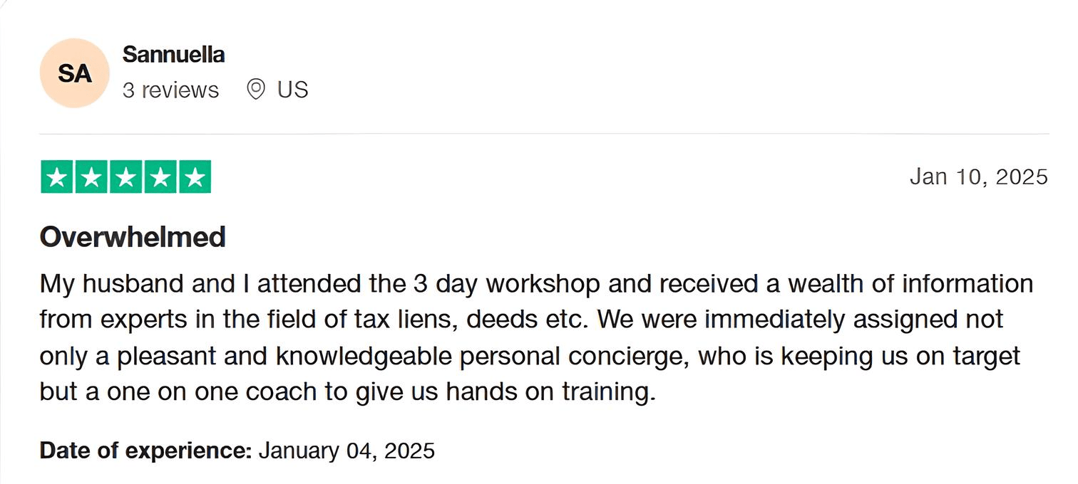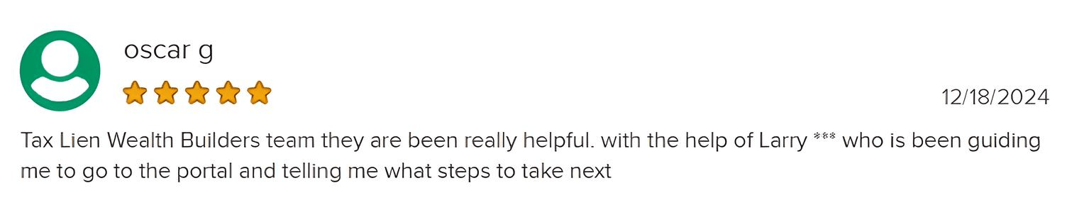 Tax Lien Wealth Builders is a direct-to-consumer real estate education and training company. We do not sell a business opportunity, “get rich quick” program or money-making system. We believe, with education, individuals can be better prepared to make investment decisions, but we do not guarantee success in investing. We do not make earnings claims, efforts claims, return on investment claims, or claims that our training will make you any money. Statements and depictions are the opinions, findings, or experiences of individuals who generally have purchased education and training. Results vary, are not typical, and rely on individual effort, time, and skill, as well as market conditions and other factors. We do not measure earnings or financial performance. Instead, we track completed transactions and satisfaction of services by voluntary surveys. Results show that most Advanced Training customers who apply the training and make offers ultimately complete transactions. You should not, however, equate completed transactions with financially successful transactions. Further, many customers do not continue with the program, do not apply what they learn, or do attempt to apply what they learn but nonetheless have difficulty in making real estate successful for them. You should assume that most customers do not complete transactions. The Company may link to content or refer to content and/or services created by or provided by third parties that are not affiliated with the Company. The Company is not responsible for such content and does not endorse or approve it. The Company may provide services by or refer you to third-party businesses. Some of these businesses have common interest and ownership with the Company. Third-party company names, logos, and products are trademarks or registered trademarks of their respective holders. I understand that by submitting this application, I am also authorizing Tax Lien Wealth Builders and its partners to obtain my personal credit profile through a soft inquiry under the FCRA solely to conduct a credit pre-qualification.