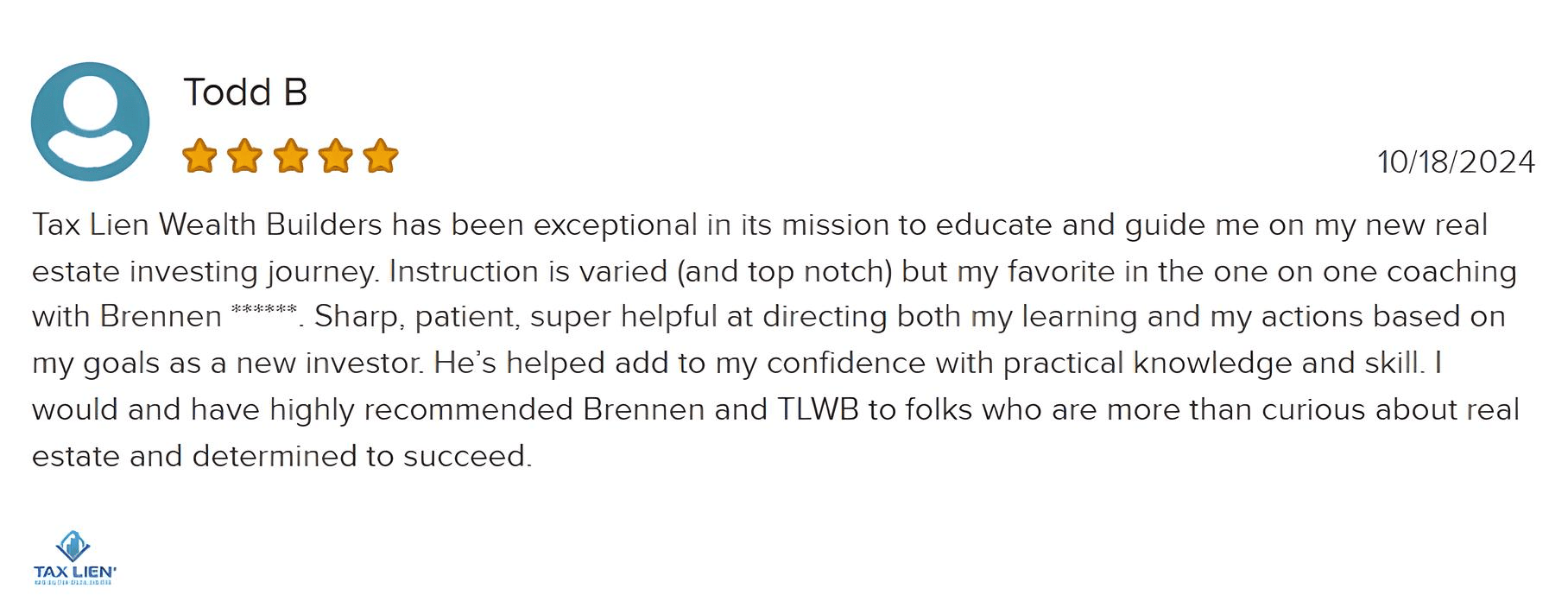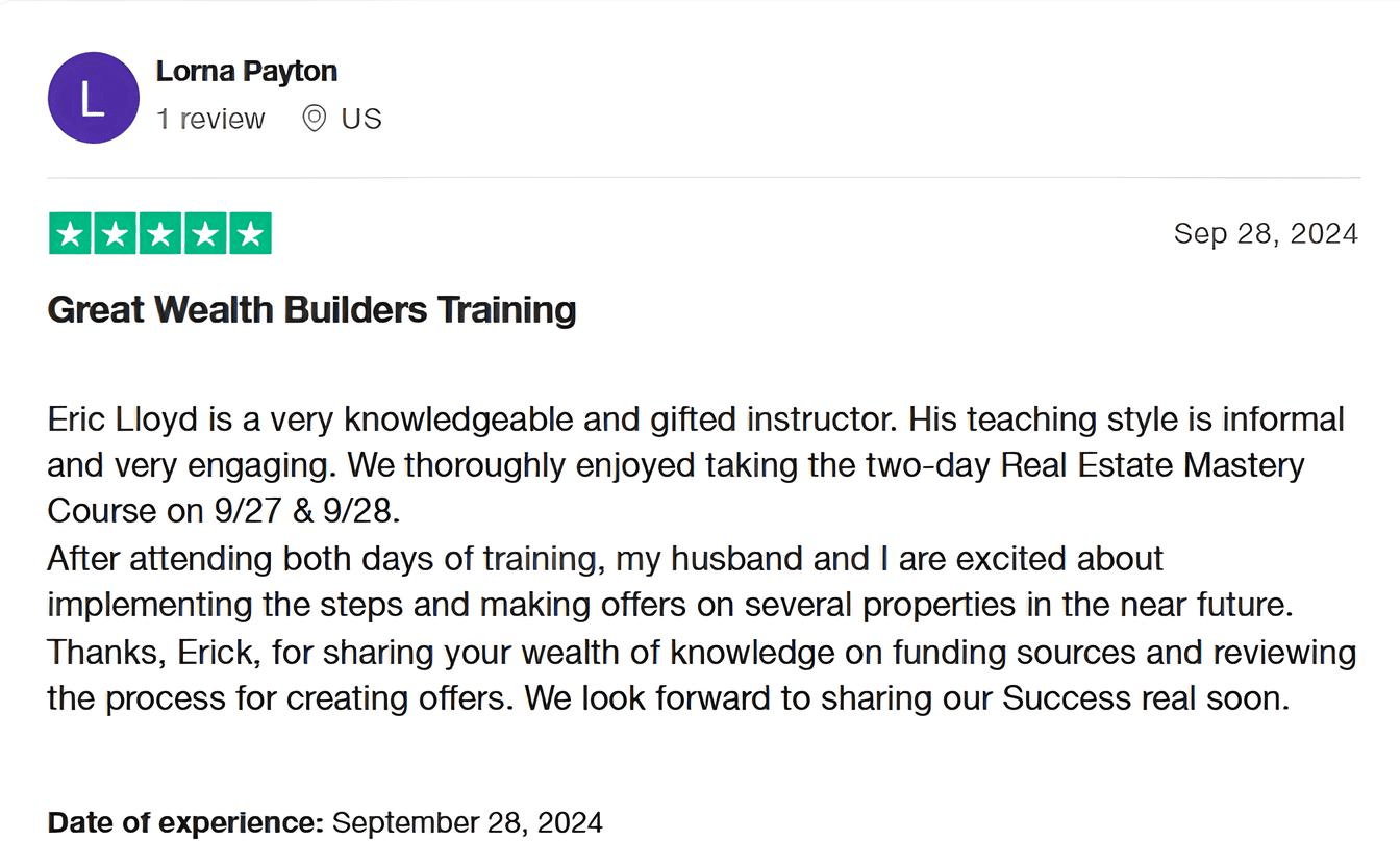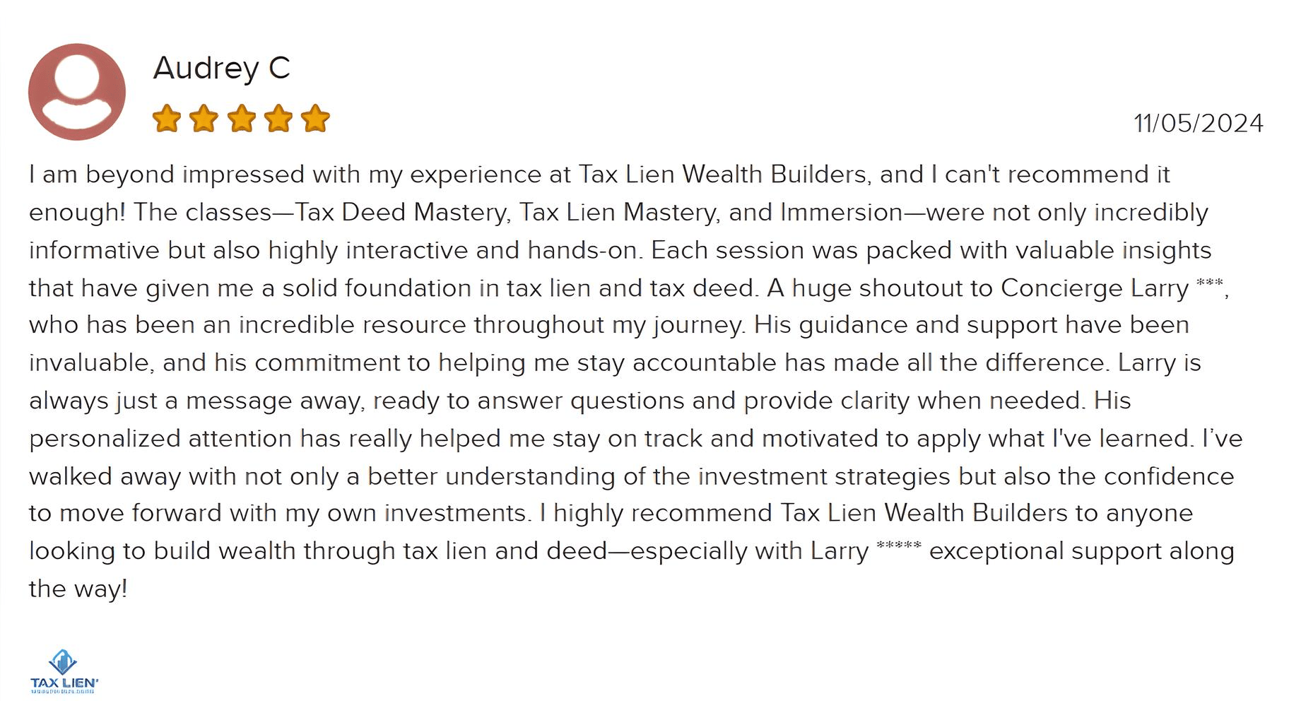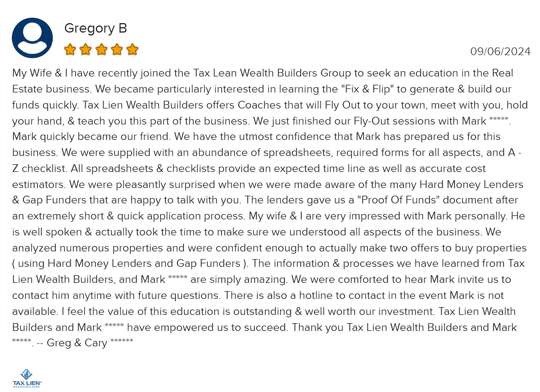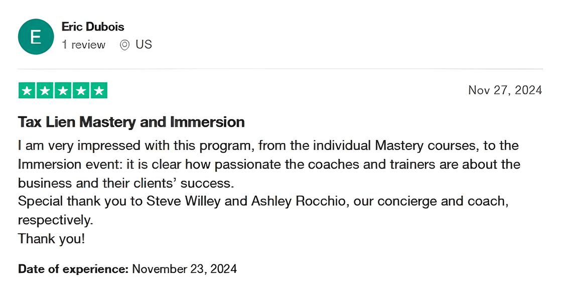 Tax Lien Wealth Builders is a direct-to-consumer real estate education and training company. We do not sell a business opportunity, “get rich quick” program or money-making system. We believe, with education, individuals can be better prepared to make investment decisions, but we do not guarantee success in investing. We do not make earnings claims, efforts claims, return on investment claims, or claims that our training will make you any money. Statements and depictions are the opinions, findings, or experiences of individuals who generally have purchased education and training. Results vary, are not typical, and rely on individual effort, time, and skill, as well as market conditions and other factors. We do not measure earnings or financial performance. Instead, we track completed transactions and satisfaction of services by voluntary surveys. Results show that most Advanced Training customers who apply the training and make offers ultimately complete transactions. You should not, however, equate completed transactions with financially successful transactions. Further, many customers do not continue with the program, do not apply what they learn, or do attempt to apply what they learn but nonetheless have difficulty in making real estate successful for them. You should assume that most customers do not complete transactions. The Company may link to content or refer to content and/or services created by or provided by third parties that are not affiliated with the Company. The Company is not responsible for such content and does not endorse or approve it. The Company may provide services by or refer you to third-party businesses. Some of these businesses have common interest and ownership with the Company. Third-party company names, logos, and products are trademarks or registered trademarks of their respective holders. I understand that by submitting this application, I am also authorizing Tax Lien Wealth Builders and its partners to obtain my personal credit profile through a soft inquiry under the FCRA solely to conduct a credit pre-qualification.