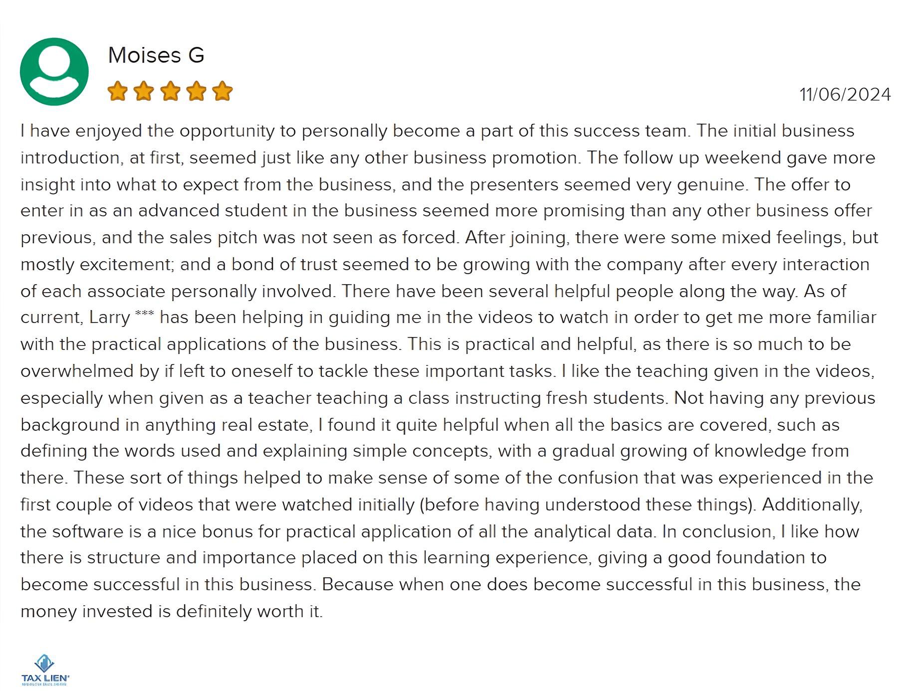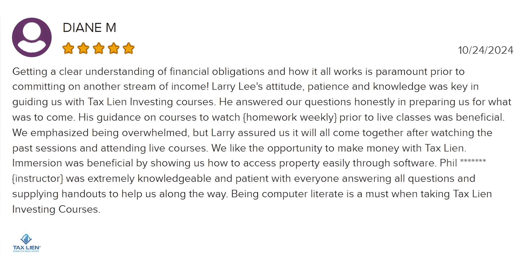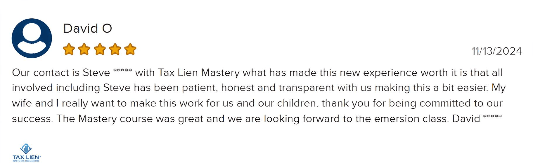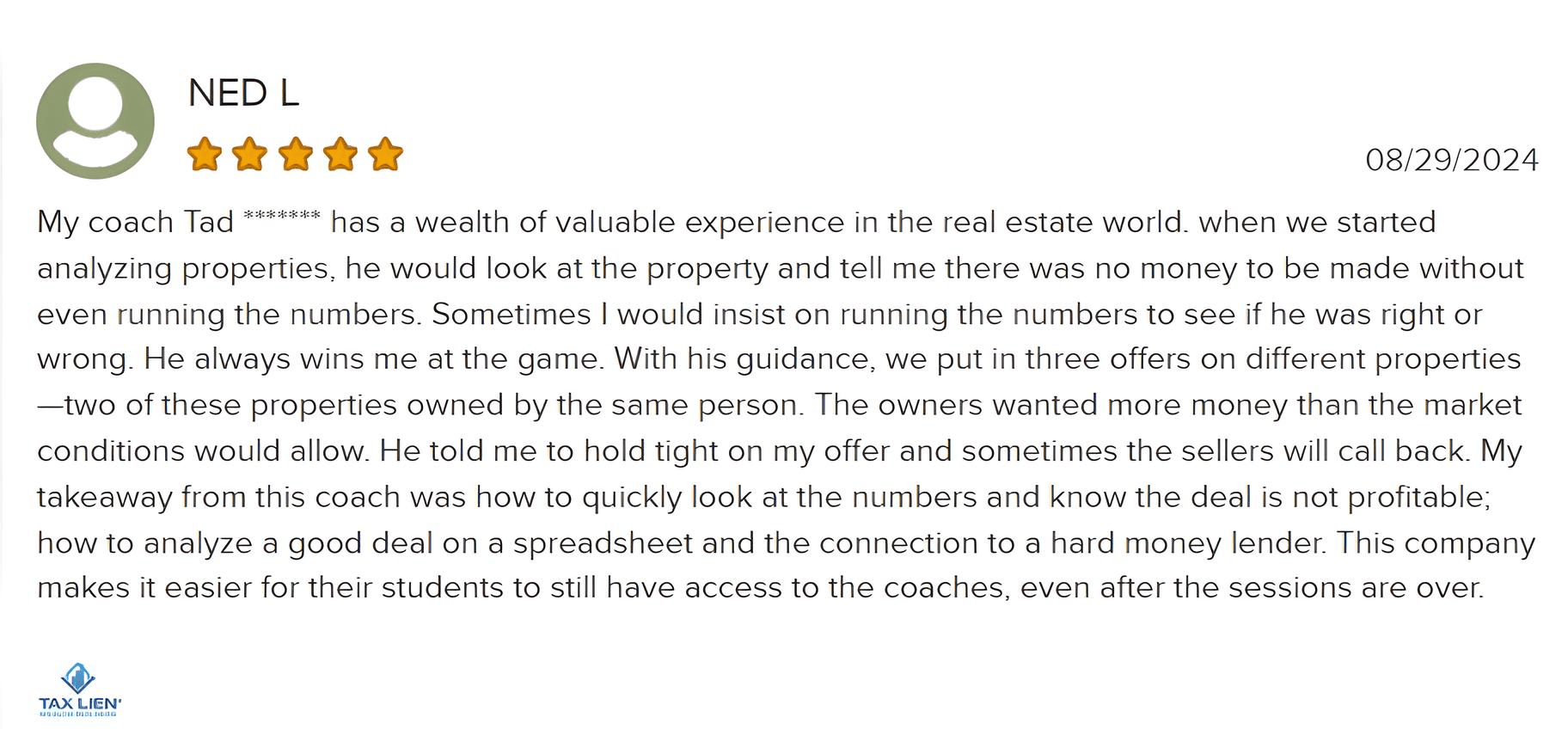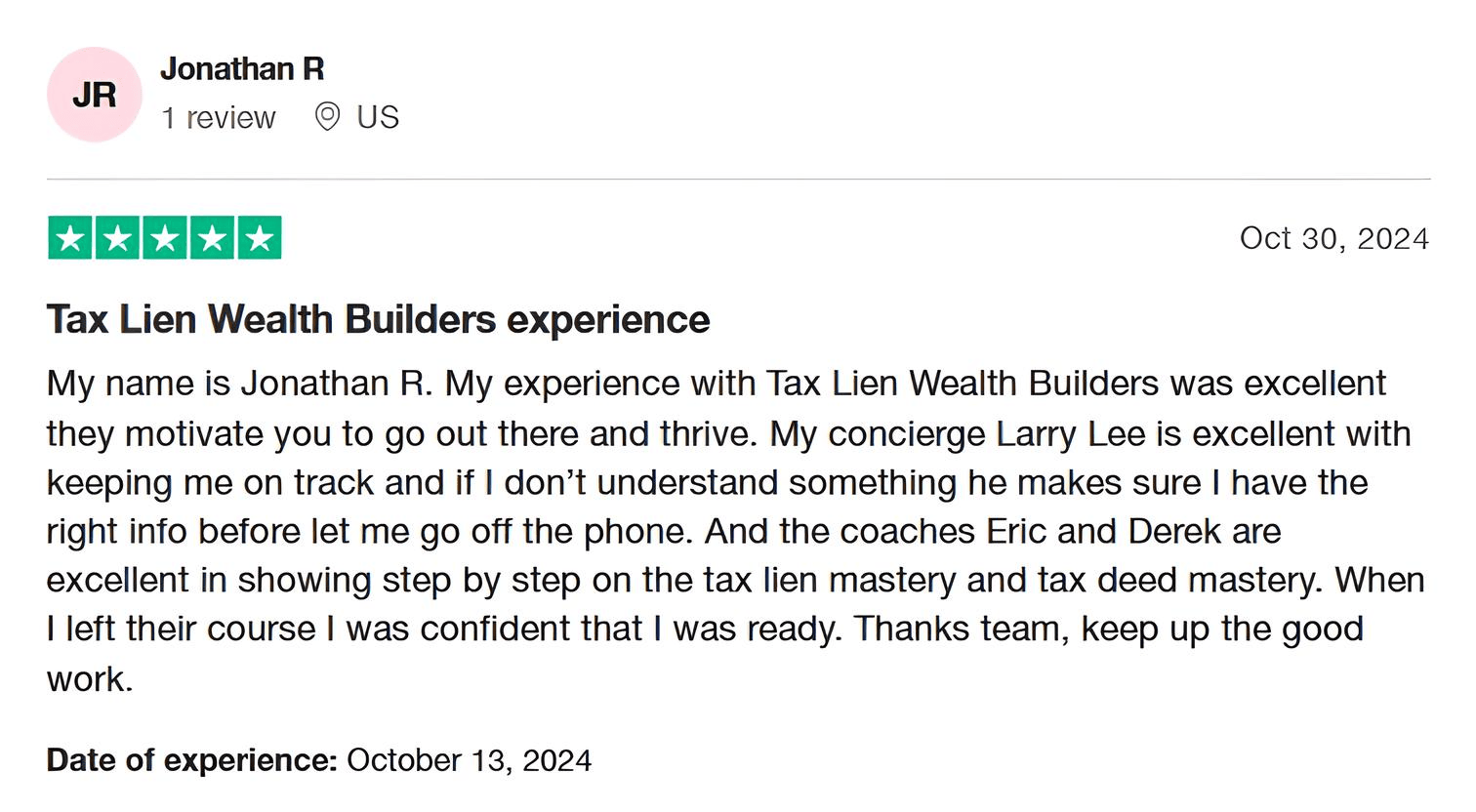 Tax Lien Wealth Builders is a direct-to-consumer real estate education and training company. We do not sell a business opportunity, “get rich quick” program or money-making system. We believe, with education, individuals can be better prepared to make investment decisions, but we do not guarantee success in investing. We do not make earnings claims, efforts claims, return on investment claims, or claims that our training will make you any money. Statements and depictions are the opinions, findings, or experiences of individuals who generally have purchased education and training. Results vary, are not typical, and rely on individual effort, time, and skill, as well as market conditions and other factors. We do not measure earnings or financial performance. Instead, we track completed transactions and satisfaction of services by voluntary surveys. Results show that most Advanced Training customers who apply the training and make offers ultimately complete transactions. You should not, however, equate completed transactions with financially successful transactions. Further, many customers do not continue with the program, do not apply what they learn, or do attempt to apply what they learn but nonetheless have difficulty in making real estate successful for them. You should assume that most customers do not complete transactions. The Company may link to content or refer to content and/or services created by or provided by third parties that are not affiliated with the Company. The Company is not responsible for such content and does not endorse or approve it. The Company may provide services by or refer you to third-party businesses. Some of these businesses have common interest and ownership with the Company. Third-party company names, logos, and products are trademarks or registered trademarks of their respective holders. I understand that by submitting this application, I am also authorizing Tax Lien Wealth Builders and its partners to obtain my personal credit profile through a soft inquiry under the FCRA solely to conduct a credit pre-qualification.