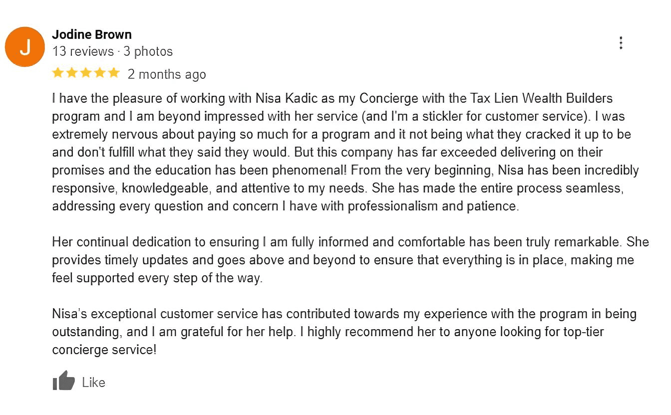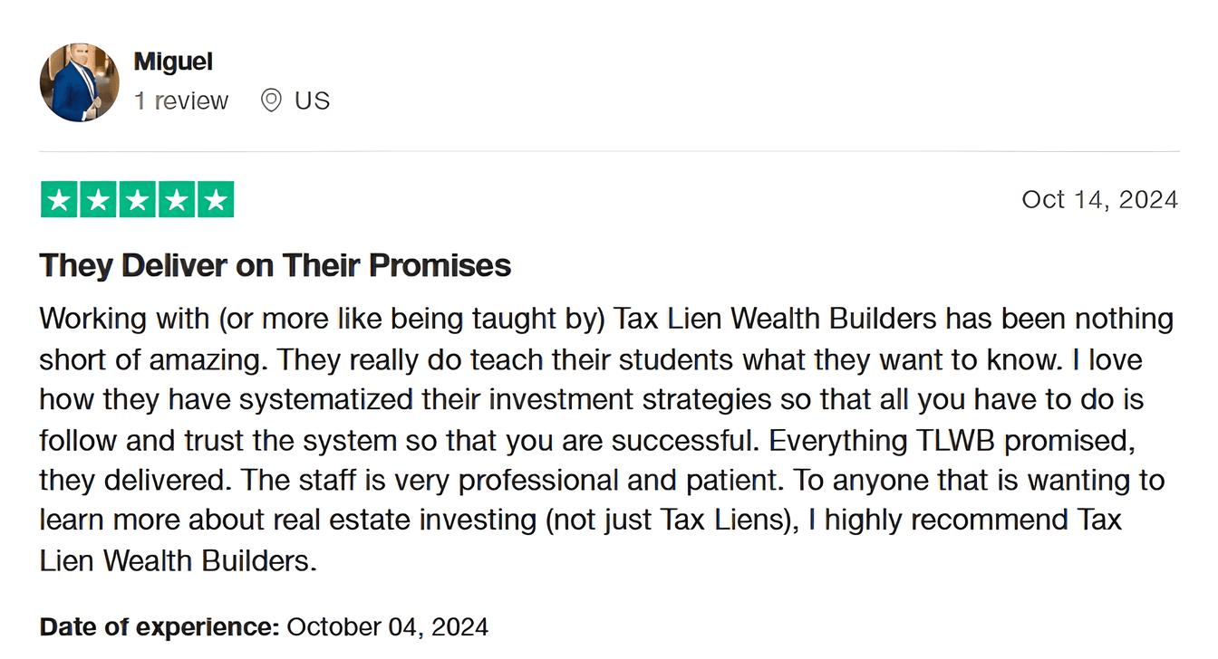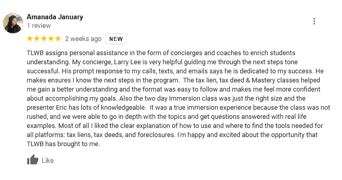 Tax Lien Wealth Builders’ information, presentation, materials, and all other media components of its Website and events are copyrighted. Any duplication, reproduction, redistribution, or recording, of any nature, is strictly prohibited. The testimonials and student experiences shared are from our top students who have shared their success with us. Many do not apply the strategies employed by these students and therefore do not have success. Many of these students also purchased additional training materials. We provide educational products and training and do not sell a business or business opportunity; individuals who purchase our educational products and training may not make any money. Individual results vary and depend on the time, energy, knowledge and money an individual put into their real estate investments, as well as other factors beyond the control of the individual. We provide real estate, tax & entity education. Investing of any kind carries risk and it is possible to lose some or all of your money. The training provided is general in nature, and some strategies may not be appropriate for all individuals or all situations. We make no representation regarding the likelihood or probability that any actual or hypothetical investment will achieve a particular outcome or perform in any predictable manner. Past performance is not a guarantee of future success. Be advised that we do not give any individual real estate recommendation. It is highly recommended that individuals work with licensed real estate brokers, agents, and professionals for any real estate transactions. We do not provide accounting or legal advice, nor do we prepare tax returns or entity structuring. Prior to undertaking any business transaction, we encourage you to consult your own accounting, real estate, legal or tax advisor.